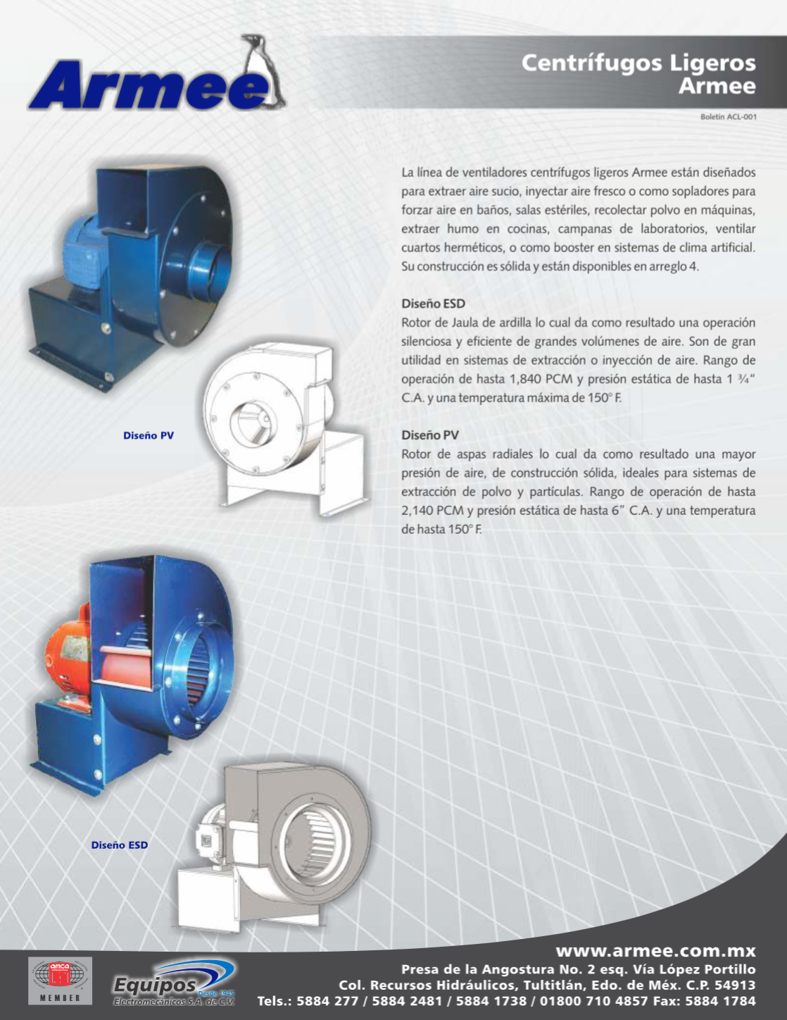 La línea de ventiladores centrífugos ligeros Armee están diseñados para extraer aire sucio, inyectar aire fresco o como sopladores para forzar aire en baños, salas estériles, recolectar polvo en máquinas, extraer humo en cocinas, campanas de laboratorios, ventilar cuartos herméticos, o como booster en sistemas de clima artificial. Su construcción es sólida y están disponibles en arreglo 4.